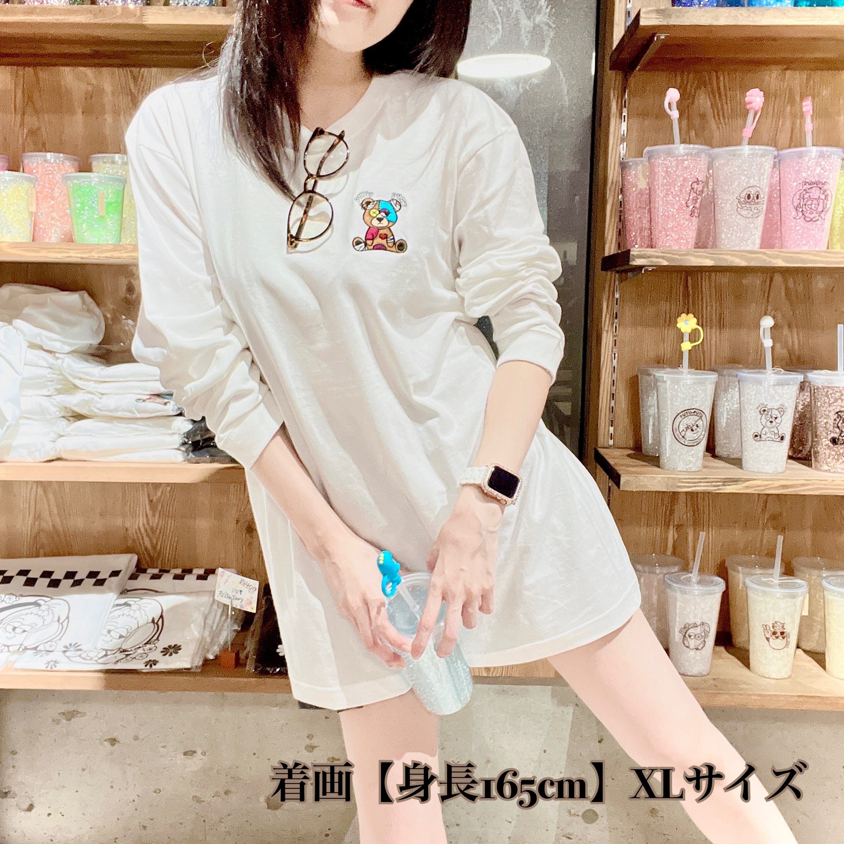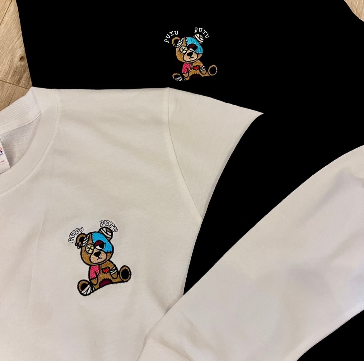 もっとも人気なつぎはぎクマちゃんを、胸元に贅沢にも刺繍をしております